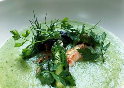 Kold sommersuppe af grønne asparges, agurker, dild & citronmelisse