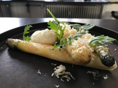 Thomas Herman laver pocheret æg som man gør det på den trestjernede restaurant Arzak i San Sebastian med andefedt og trøffelolie. Det går smukt i spænd med stegte asparges og salt Havgus-ost.