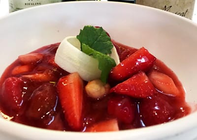 Rødgrød med mynte-creme anglaise & vaniljesyltede asparges