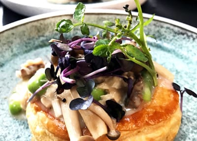 Den ydmyge tartelet har fået en overhaling med morkler, friske ærter og violette asparges. Tarteletterne er selvfølgelig hjemmebagte og de sur-sød syltede svampe tilfører retten noget forfriskende syre.